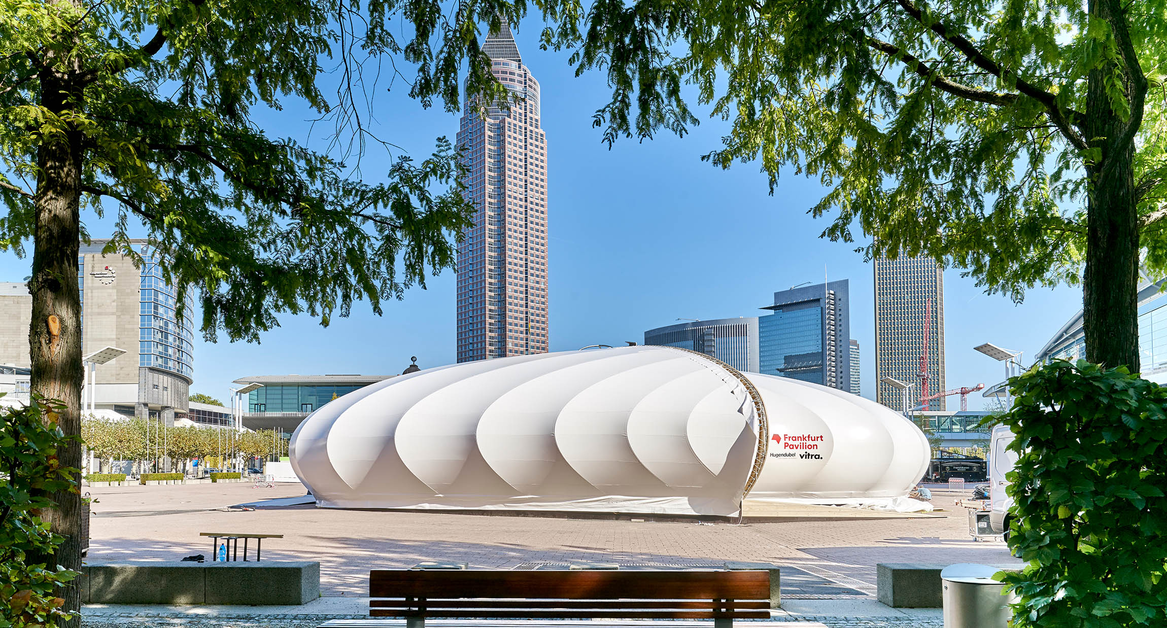 The Frankfurt Pavilion is a temporary building designed that can be used multiple times, which saves resources since it can be stored away in a space-saving manner and is constructed of materials that can be recycled without residue.