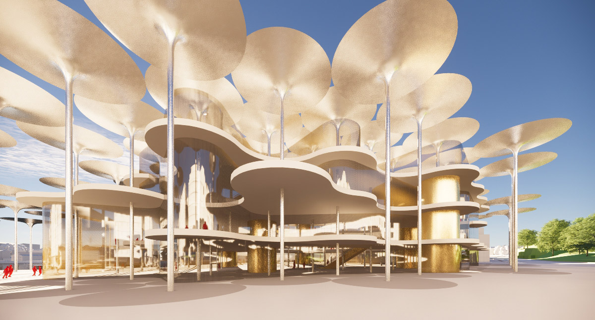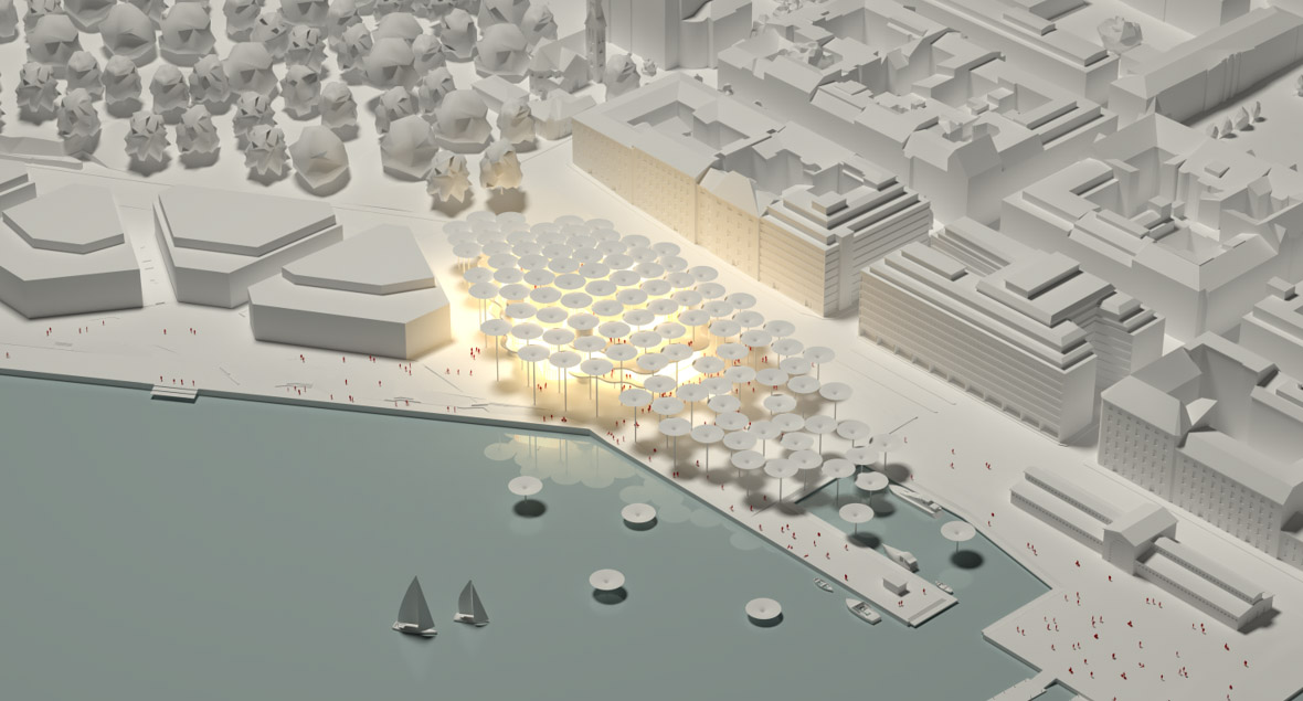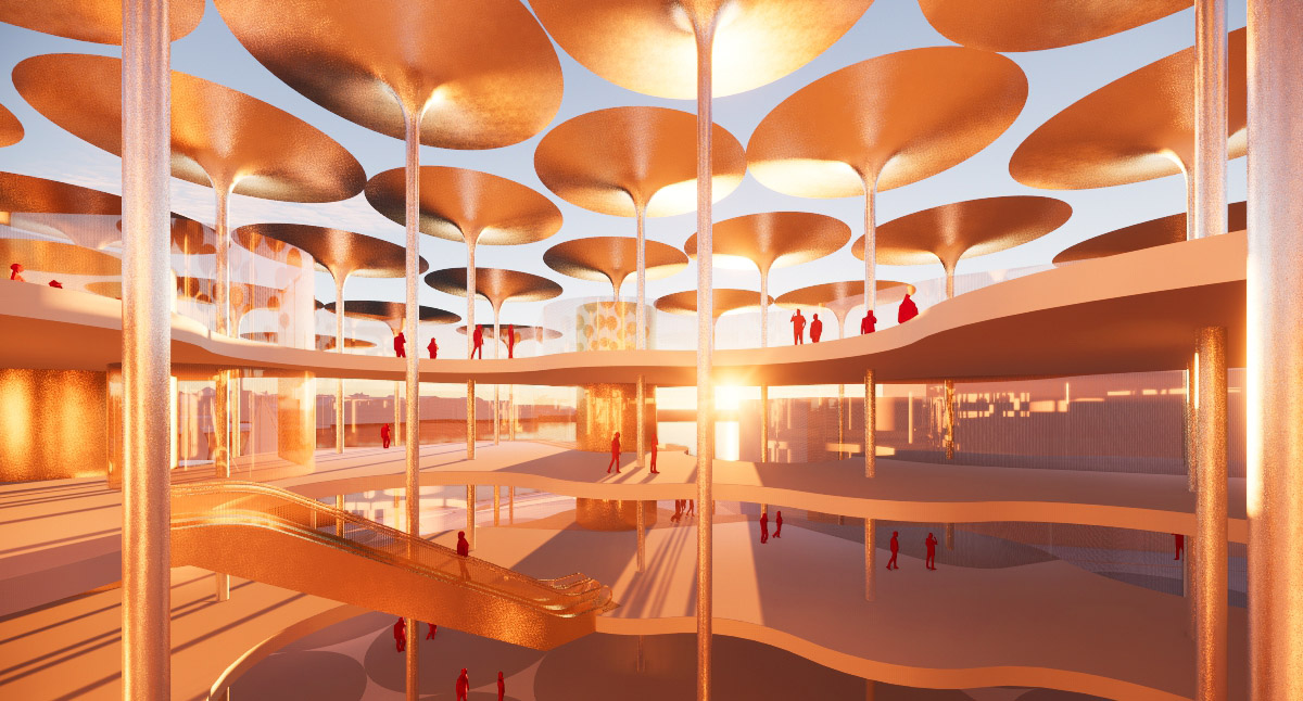 The design by schneider+schumacher envisages flexible public space acting as a cultural and social hub within the new Museum of Architecture and Design. The design aims to blur the boundaries between internal and external spaces with easily discernible exhibition areas which integrate the outside world. Upper floors are designed as a system of interconnected circles which dictate the overall spatial arrangement centred on an atrium. The building’s façades are printed with patterns consisting of smaller circles, offering varying degrees of transparency. Roofs are designed as funnels that extend beyond the footprint of the building. These form a protective canopy – a modern take on the archetypal shelter – offering not only protection from the elements but also potential for diverse planting arrangements.