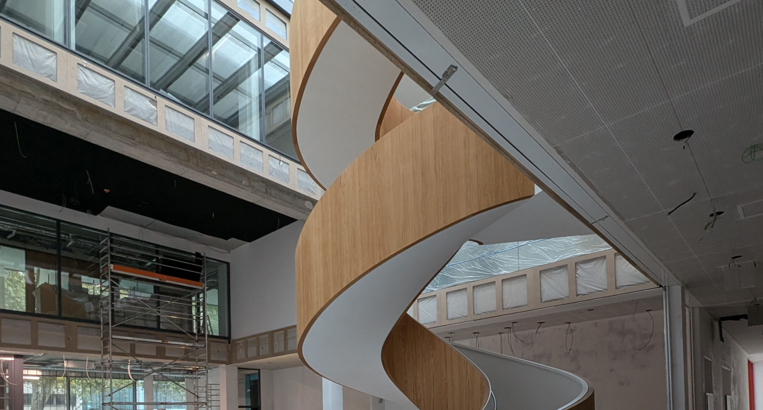 The atrium with its sculptural spiral staircase acts as a focal point of the building. The wooden construction lends the interior a warm, pleasant atmosphere and offers good acoustics. Sustainability is both enduring and beautiful. Christian Simons explains: ‘That’s why we always try to construct buildings so that they are not only of high-quality and people can easily use them, but are also flexible and lend themselves to being converted, so that rather than being taken down, they can be internally reorganised.’