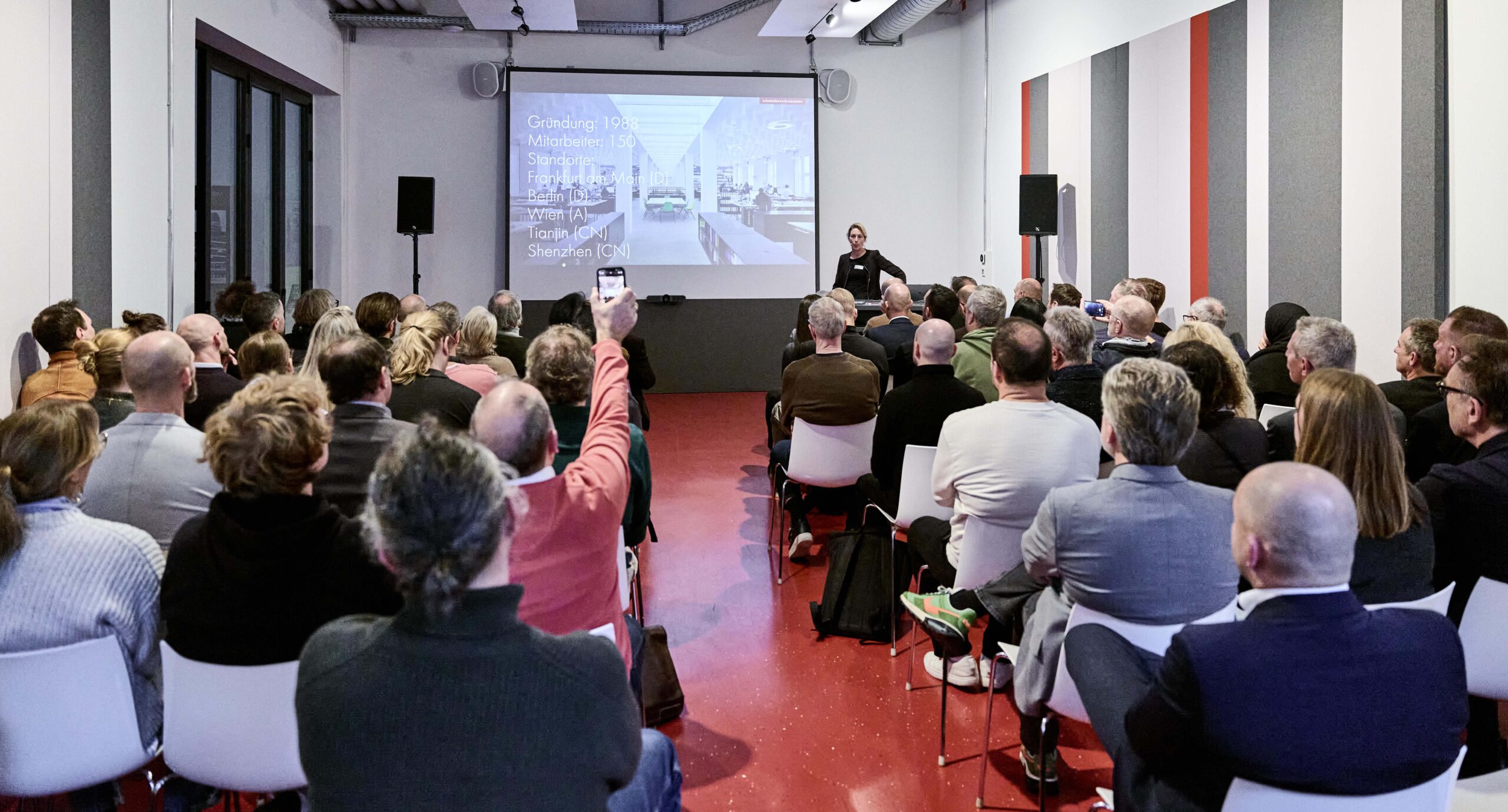 In the subsequent presentation Sabine Plagemann, member of the management board, explained how artificial intelligence is increasingly being integrated into daily work processes at schneider+schumacher. To promote the use of AI, schneider+ Schumacher set up an internal working group to facilitate discussion on the topic and to drive forward the testing of new AI-supported systems. Nowadays in the office, AI primarily takes on administrative tasks, generating more space for creative design work. At the same time, as Sabine Plagemann emphasised, AI is increasingly being used in all phases of architectural planning. Text-based AI systems such as ChatGPT or BauGPT can provide support in all phases of drafting protocol, writing explanatory texts or answering planning questions. During the design process, AI contributes to the development of ideas and forms. For example, detailed images or 3D models can be created from texts or sketches, allowing variants to be visualised. Tools such as Grasshopper and Rhino allow the input of urban planning parameters and automatically check clearance areas. In terms of sustainability, AI enables more resource- and space-efficient planning and can easily perform environmental analyses. In this respect, sun and wind studies help to adapt buildings to changing climatic conditions.