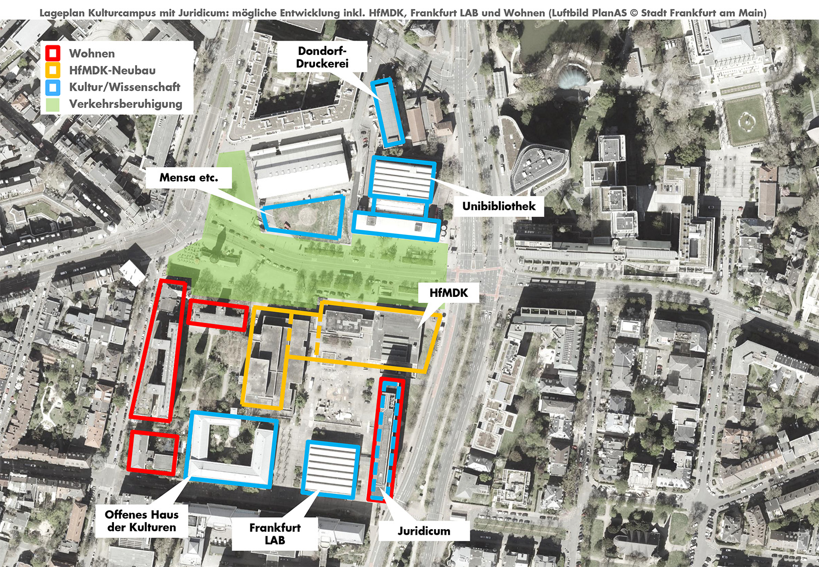 Under the headline “New idea for Frankfurt’s cultural campus”, the FAZ reported at the end of February on a citizens’ initiative led by Martin Wentz, Frankfurt’s former head of urban planning. The initiative’s proposal – which is actually not a new idea – is to demolish the Juridicum, as this is the only way to create enough space south of Bockenheimer Landstraße for a single, contiguous building for the University of Music and Performing Arts (HfMDK). According to Martin Wentz, the current development plan “could easily be amended through a simplified procedure – especially as it will be several years before construction begins anyway”.