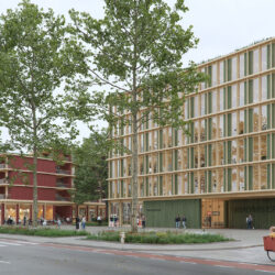 The new building was designed by schneider+schumacher as a compact structure that fits perfectly on the two different sides of the site and blends in with the heterogeneous characteristics of the existing buildings. Behind a folded, generously glazed façade, spaces are created for contemporary, sustainable and inspiring working and training environments.